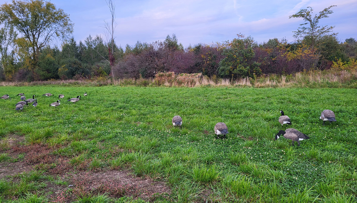 La méthode de chasse? La semaine juste avant l’ouverture aller prospecter en visant deux choses, soit de trouver un ou deux champs autour desquels des voiliers de bernaches ont perdu de l’altitude et sont venues faire quelques cercles en s’y posant ou non. En effet, si le champ a suscité l’intérêt de ces voiliers, il le fera tout autant avec les prochains qui arriveront du nord. Une bonne installation, une cache bien camouflée dans la verdure flamboyante du début de l’automne et quelques appels bien placés auront tôt fait de faire entrer quelques voiliers à portée de tir. Pas besoin de sortir toute l’armada, non, trois ou quatre douzaines d’appelants réalistes feront l’affaire. Comme il fait souvent chaud en ces fins d’après-midi de fin septembre, vous aurez pris soin de disposer vos appelants en groupes lâches avec au moins 2-3 m entre chaque individu (photo 4), sauf s’il vente à écorner les bœufs, comme souvent du sud-ouest à cette époque de l’années, vous resserrerez votre plan en conséquence