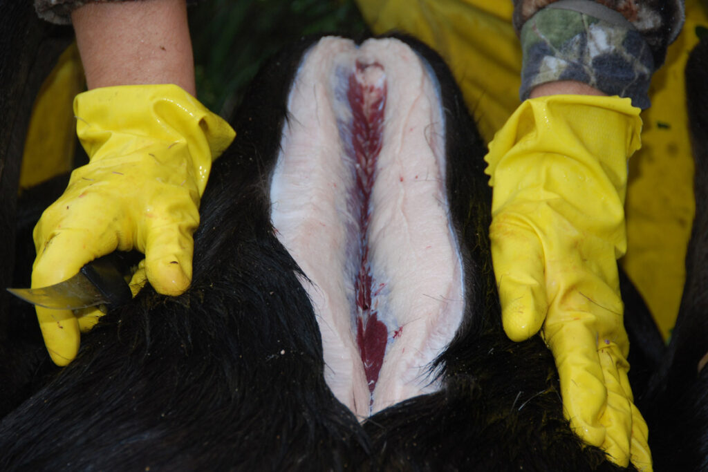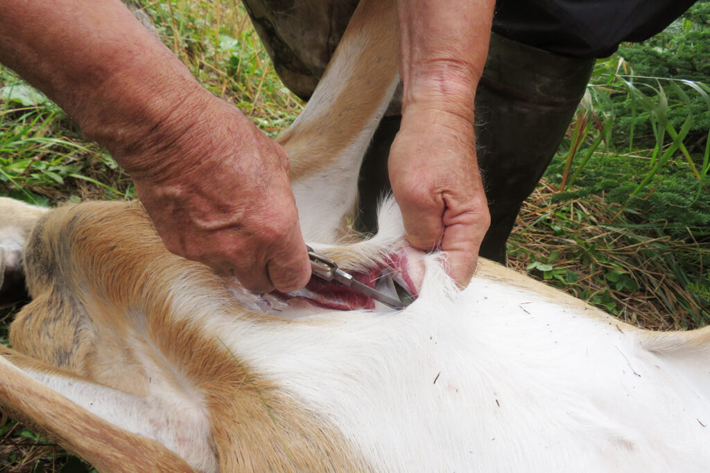 Pour procéder à une éviscération propre de son gibier, il est important de le placer sur le dos et bien droit pour permettre aux viscères de descendre vers le bas par gravité. Les doigts aideront ensuite à maintenir les intestins loin de la pointe du couteau.
