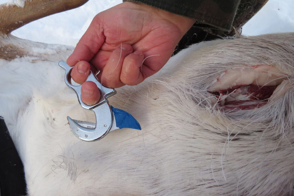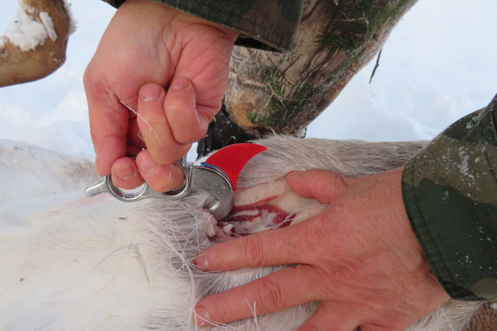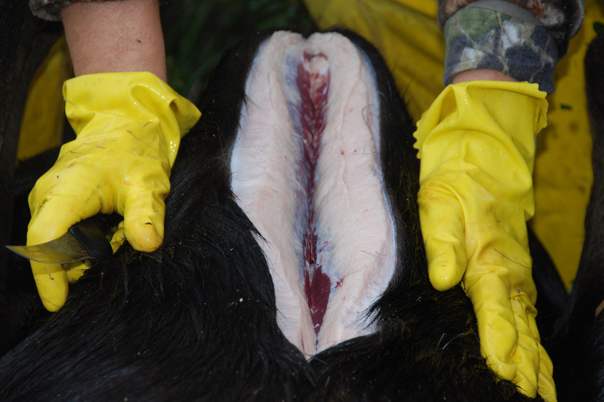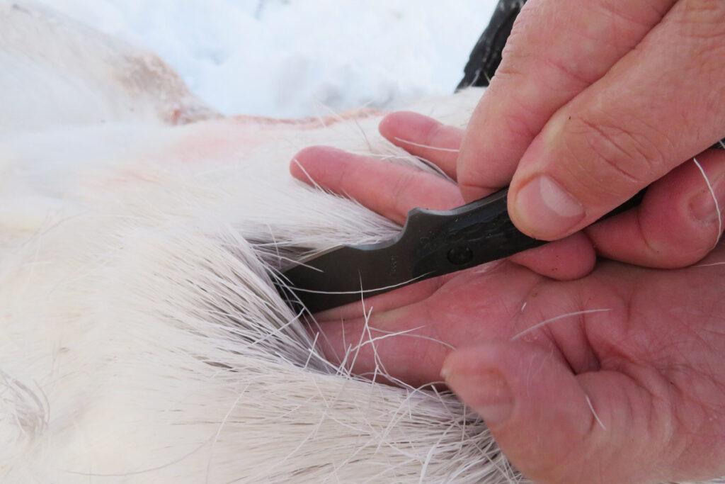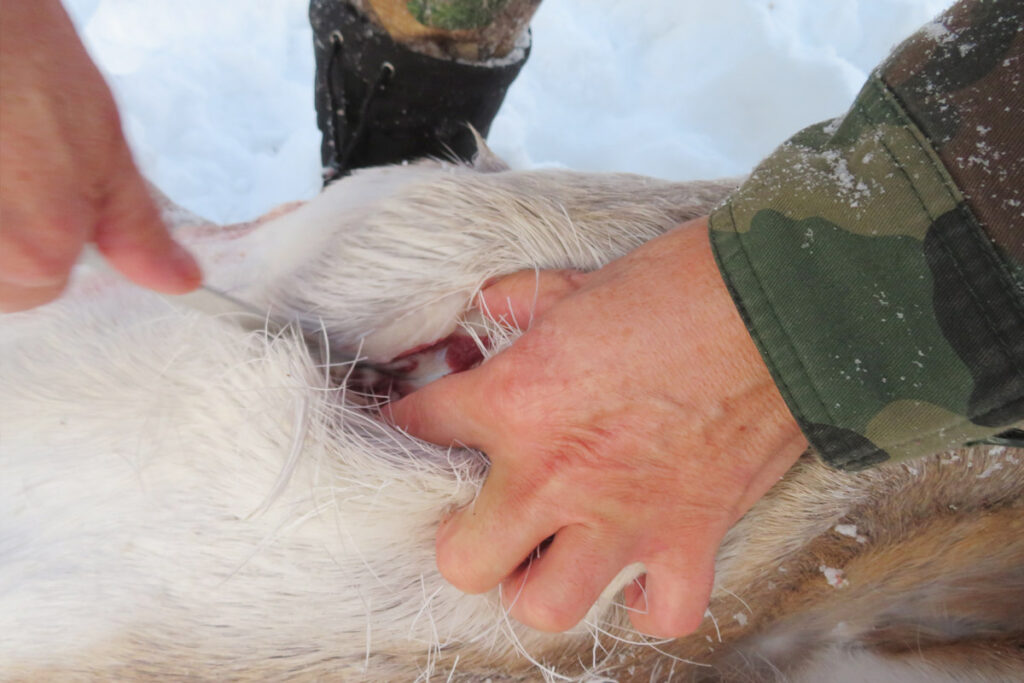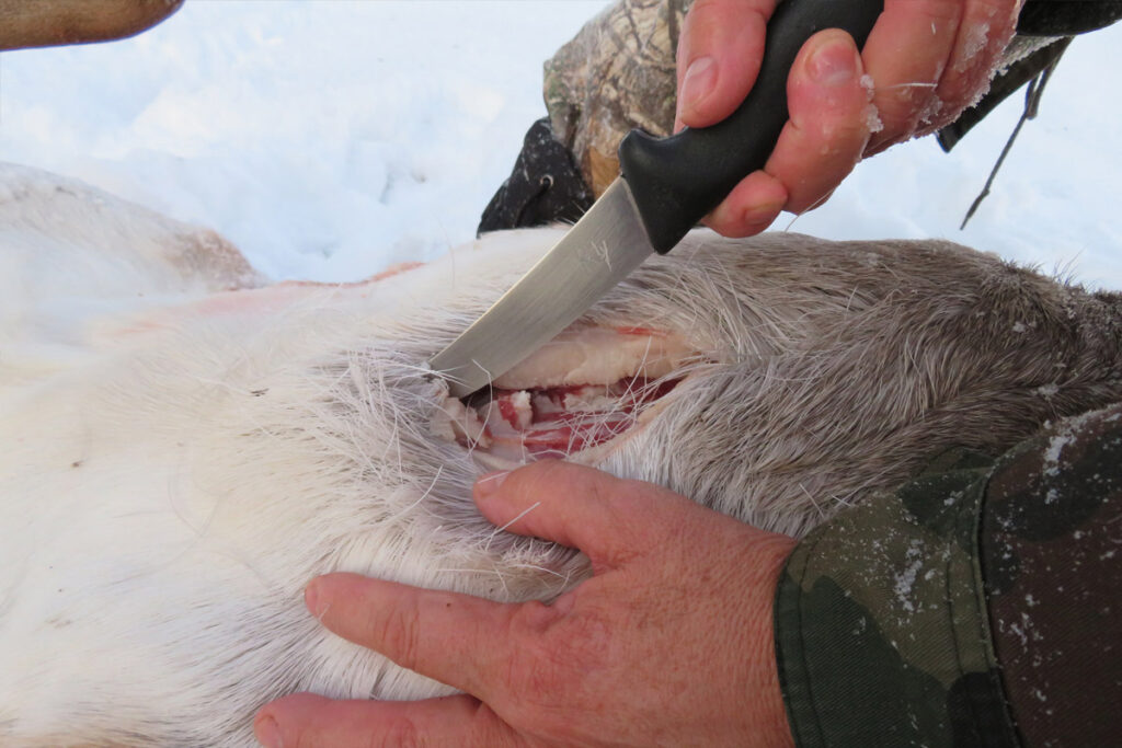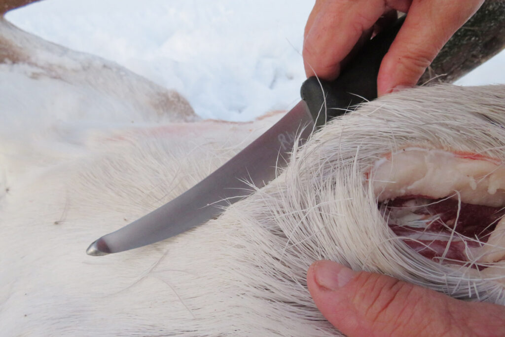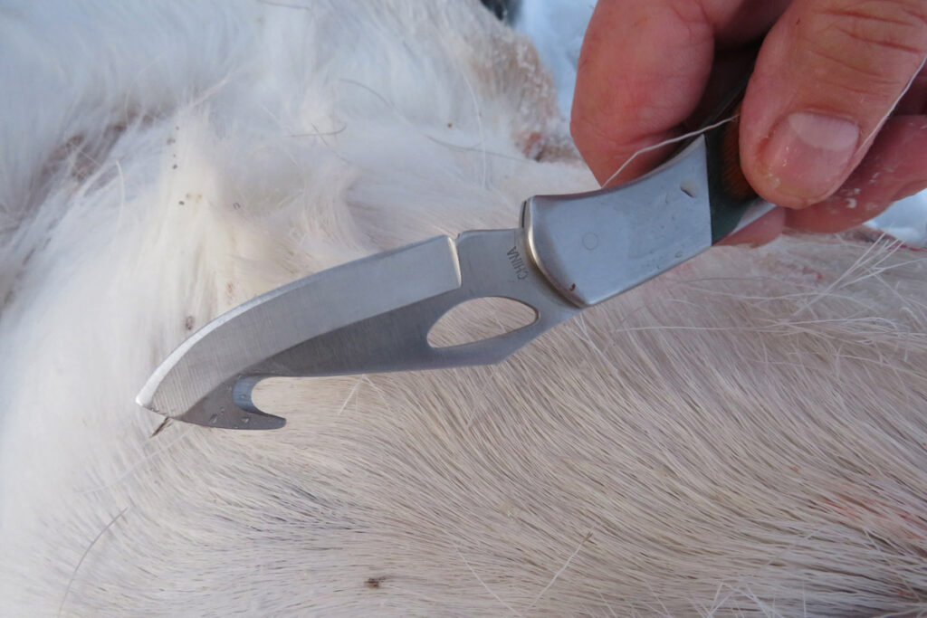 Les couteaux d’éviscération sont des outils qui vont vous permettre d’effectuer l’ouverture abdominale de façon beaucoup plus sécuritaire que l’utilisation d’une lame régulière. Peu importe le type de lame, procédez lentement et si cela est nécessaire, ajustez simplement l’angle de coupe afin de favoriser la progression de la lame (photo 19). Pour plusieurs, même si le couteau à éviscération est un outil de plus dans le sac à dos, son utilisation réduira grandement les risques de contamination venant du contenu stomacal ou intestinal de l’animal.