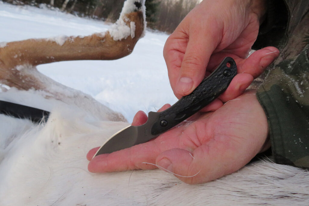 Personnellement, j’ai essayé trois différents modèles mais je suis toujours revenu au Wyoming, tout en métal. Vous pouvez facilement éviscérer une dizaine de chevreuils avant d’aiguiser ou de changer la lame. Le cuir de l’orignal est beaucoup plus exigeant pour le taillant. Après trois éviscérations, un aiguisage ou un remplacement de lame doit être envisagé.