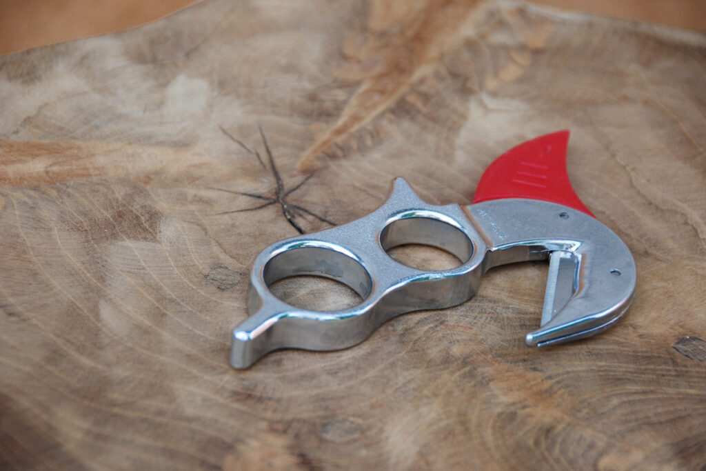 La plupart des modèles possèdent, sur le dessus, un couteau qui a la forme d’un aileron (comme un requin) qui est protégé par un capuchon en plastique. Cette lame est très coupante et peut être utilisée pour couper la peau sur le sternum. Le protecteur (capuchon) de l’aileron est très facile à perdre, ce qui rend le couteau très dangereux. Personnellement, j’ai placé un ruban gommé sur le taillant de l’aileron pour le rendre inoffensif et maintenir le protecteur en place (photo 13).
