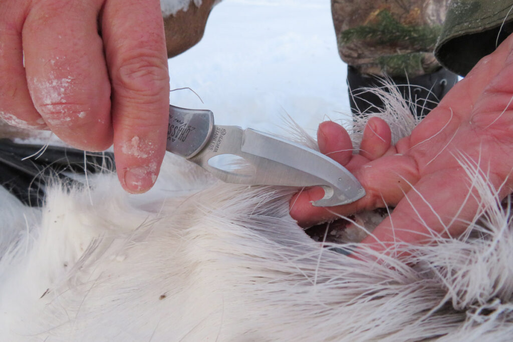Insérez la pointe recourbée du couteau au bout du cartilage du sternum et redressez le couteau légèrement (photo 11). La lame du couteau devrait couper la peau et/ou la membrane abdominale assez facilement. S’il y a une résistance, modifiez simplement l’angle de coupe ou la prise en main ce qui peut être nécessaire pour l’orignal (photo 12). Avec un minimum de pratique, la coupe se fait presqu’aussi aisément que d’ouvrir une fermeture éclair.