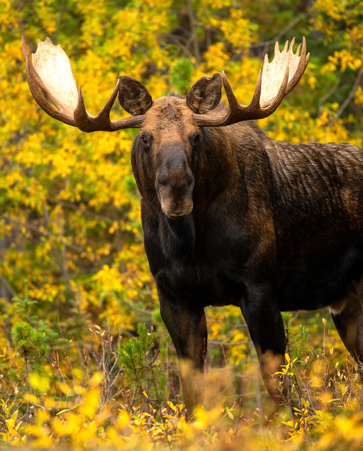 L’odorat et l’audition sont dans l’ordre les sens les plus développés des orignaux. Ce mâle qui porte toute son attention vers le photographe est en mode alerte et tente d’identifier l’intrus.