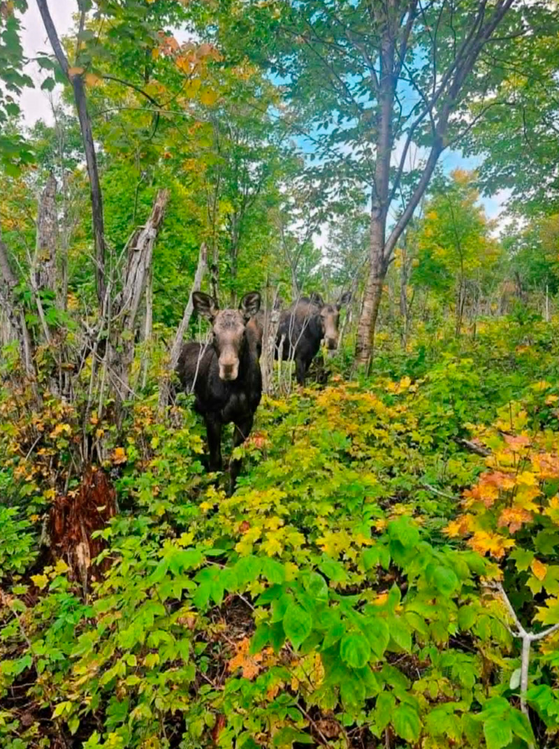 Lorsqu’on se dirige vers des orignaux en imitant leurs comportements il est parfois possible de les approcher à très courte distance comme on peut le voir sur la photo. L’auteur, accompagné de 3 autres chasseurs et accompagnateurs, étaient rendus à moins de 3 m lorsque ce veau et cette femelle ont commencé à se poser des questions…